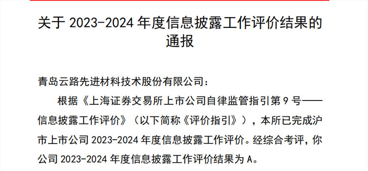 近日,上海證券交易所公布《滬市上市公司2023-2024年度信息披露工作評(píng)價(jià)結(jié)果》,云路股份(688190.SH)獲最高評(píng)級(jí)“A”級(jí)評(píng)價(jià)。