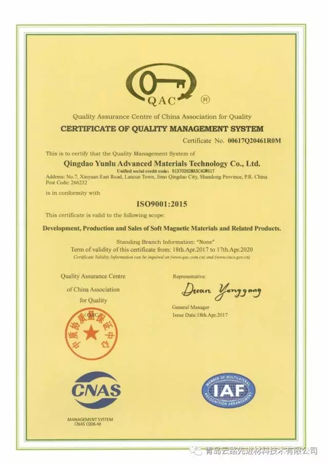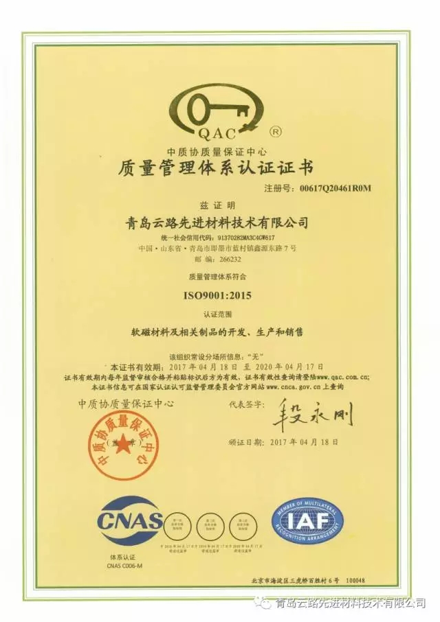 為進(jìn)一步清晰管理流程,管控運營風(fēng)險,形成標(biāo)準(zhǔn)化和規(guī)范化的管理模式,青島云路先進(jìn)材料公司自2016年5月引入ISO9001質(zhì)量管理體系,經(jīng)過全體員工不懈努力,于2017年4月18日順利取得認(rèn)證證書。2015版質(zhì)量管理體系GB/T19001于2016年12月30日正式發(fā)布,公司也成為青島市率先通過新版本認(rèn)證的企業(yè)之一。