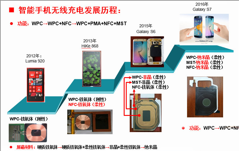 2012年諾基亞推出無線充電手機(jī)Lumia 920,所用的磁性材料是硬質(zhì)鐵氧體。2013年一款銷往海外的手機(jī)HiKe 868設(shè)計(jì)了無線充電和NFC的集成,配備的磁性材料是WPC-鐵氧體(剛性)、NFC-鐵氧體(柔性)。2015年手機(jī)無線充電發(fā)生了里程碑式的變化,三星推出首款無線充電旗艦手機(jī)Galaxy S6,不僅兼容兩種無線充電的標(biāo)準(zhǔn),WPC和PMA,還配置了兩種支付標(biāo)準(zhǔn)NFC和MST,匹配用的軟磁屏蔽材料除了鐵氧體外,首次使用了非晶導(dǎo)磁片,使得手機(jī)不僅做的輕薄精美,還大幅提升了無線充電效率。到2016年三星又做了改進(jìn),把磁性材料全部換成了更加先進(jìn)的納米晶導(dǎo)磁片,引領(lǐng)無線充電技術(shù)的變革,始終處于領(lǐng)先地位。從這幾年的發(fā)展歷程看,在功能上從單純的無線充電加上了NFC和MST近場通訊的功能。磁性材料則從鐵氧體逐漸過渡到納米晶。