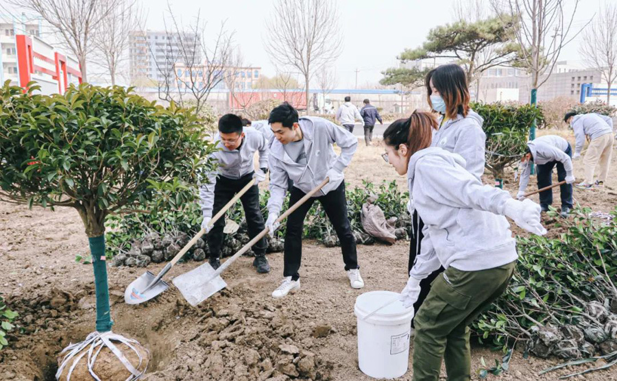 植樹現(xiàn)場,大家熱情高漲,到處是忙碌的身影,各部門間相互協(xié)作,分工配合,或掘坑培土或提水澆灌,親手栽下一棵棵充滿希望和生機的新苗,為春和景明再增盎然生機。
