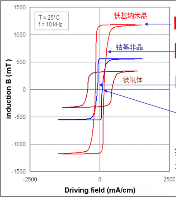 幾種鐵基納米晶與鐵基非晶、鈷基非晶、鐵氧體之間的比較:飽和磁通密度:鐵基納米晶除了比鐵基非晶略低一點(diǎn)外,明顯優(yōu)于鈷基非晶和鐵氧體;