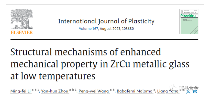 基于此,來自南京航空航天大學(xué)的楊亮教授團(tuán)隊(duì)通過分子動(dòng)力學(xué)模擬了Zr2Cu非晶合金在低溫環(huán)境中的拉伸變形行為,從自由體積剪切帶等多個(gè)角度分析了溫度降低對(duì)非晶合金微觀結(jié)構(gòu)及變形行為的作用機(jī)制,從而解釋了非晶的低溫反向增韌機(jī)理。相關(guān)研究成果以“Structural mechanisms of enhanced mechanical property in cryogenic ZrCu metallic glasses”為題在International Journal of Plasticity上發(fā)表。