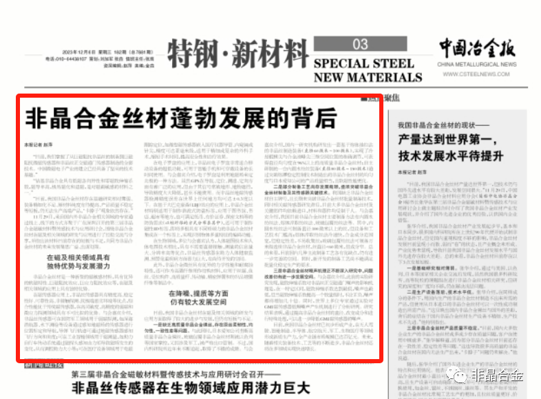 今天,《中國冶金報》刊登了一篇名為《非晶合金絲材蓬勃發(fā)展的背后》的文章,非晶中國與大家分享如下:
