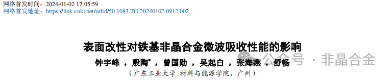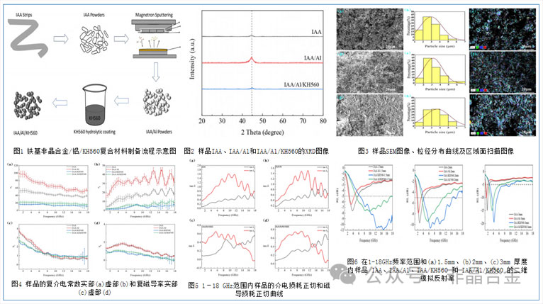 廣東工業(yè)大學(xué)材料與能源學(xué)院的殷陶等利用磁控濺射工藝在鐵基非晶合金粉體表面局部覆蓋鋁層,以此提高粉體的電導(dǎo)率,增加材料的ε″值,再在該種粉體顆粒表面包覆一層絕緣的KH560硅烷偶聯(lián)劑,改善復(fù)合材料的阻抗匹配性能。鋁層能改善絕緣包覆后粉體材料的介電損耗能力,提高相應(yīng)復(fù)合材料的中低頻微波吸收能力。相關(guān)研究成果于2024年1月在《表面改性》網(wǎng)絡(luò)首發(fā)。